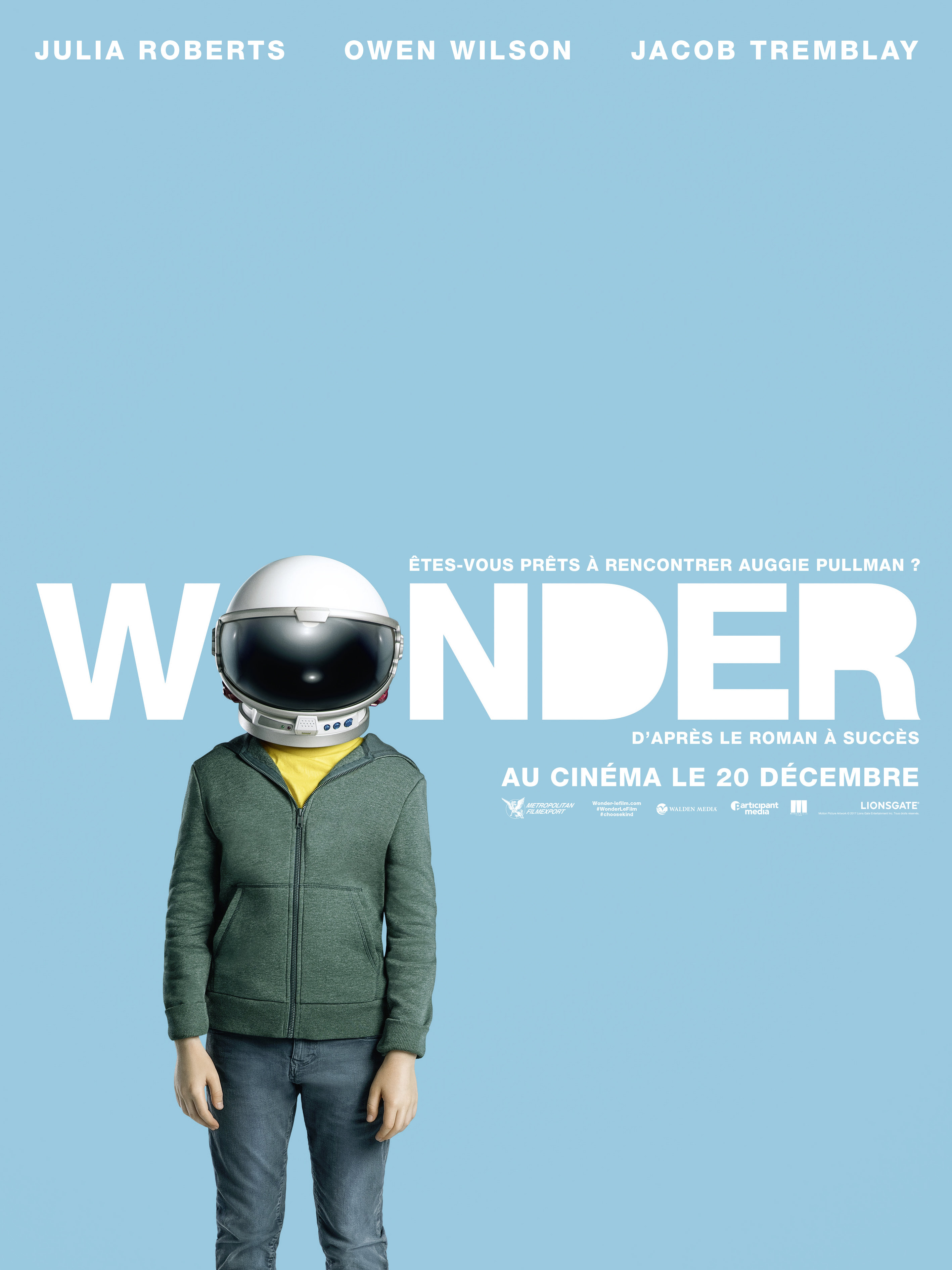 Adaptation du Best-seller de Raquel J. Palacio, Wonder le nouveau film de Stephen Chomsky, portera à l’écran Julia robert et Owen Wilson. Découvrez l’histoire D’August Pullman un petit garçon né avec une malformation au visage qui l’empêché jusqu’à présent de vivre normalement et d’aller à l’école mais aujourd’hui son entrée en CM2 va tout changer. August va devoir se battre contre les préjugés, une belle leçon de vie à découvrir le 20 Décembre au cinéma.